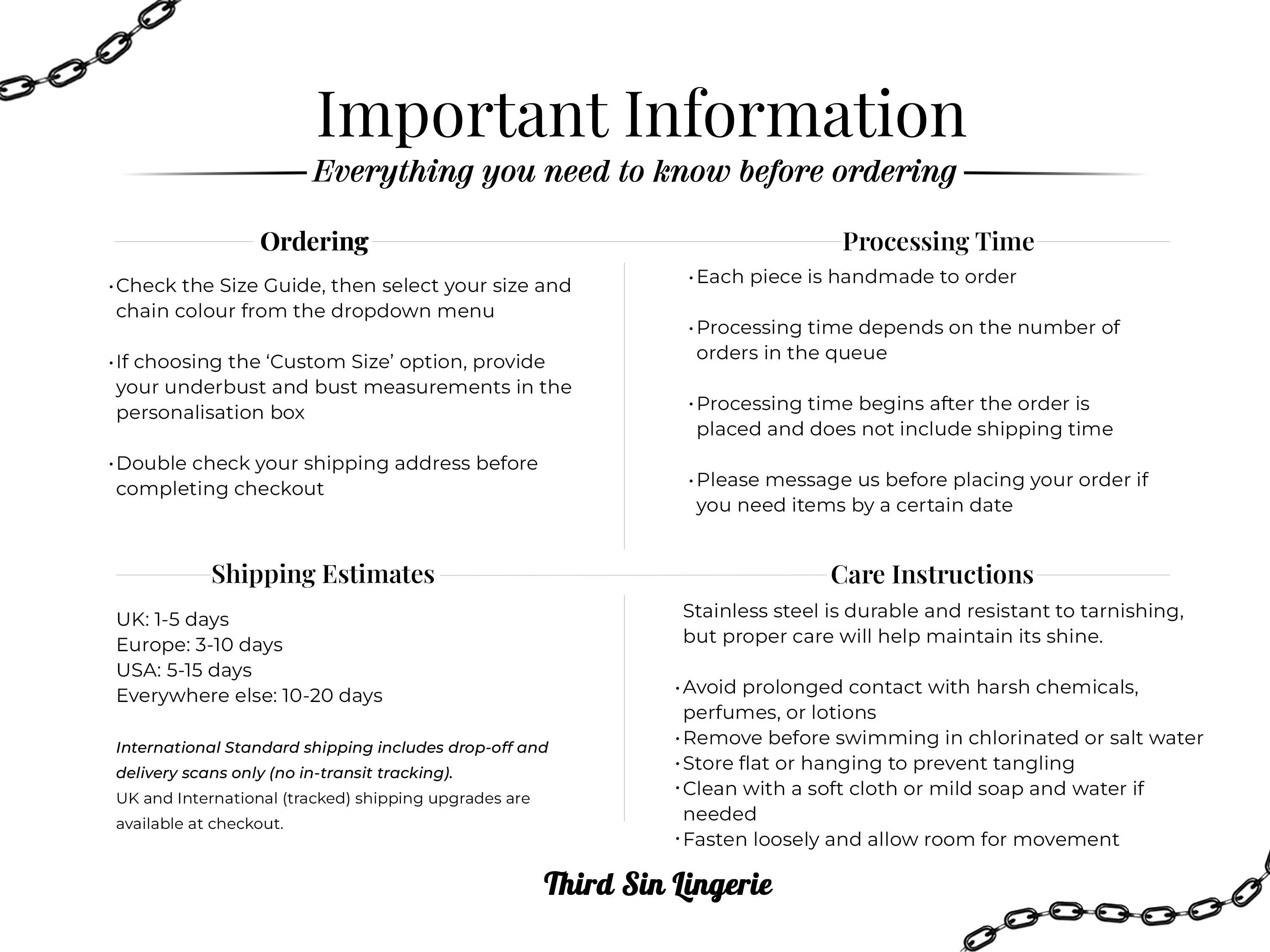 I, THIRDxSIN (Chelsea), am the data controller of your personal information as it relates to my shop. To fulfil your order, you must provide me with certain information (which you authorised Etsy to provide to me), such as your name, email address, postal address, payment information, and the details of the product that you’re ordering. You may also choose to provide me with additional personal information (for a custom order of jewellery, for example), if you contact me directly. I will only use these details to process and deliver your order, or deal with any queries you have related to that order. If you send me a message using the contact button on Etsy, I will receive your user name and email address. The only circumstances in which I will share your data are in processing your order, to settle disputes, to provide customer support or complying with the law. I will never use or pass on your information to third parties for marketing purposes or any other purpose, other than the circumstances listed below, or add you to any mailing list without your explicit consent. The circumstances in which I may share your data are :- With Etsy to comply with my obligations. With delivery companies to fulfil your order. To comply with legal or tax obligations. I will retain your details for as long as necessary in order to process the transaction and I will securely store any data collected during that period. I retain personal data related to orders or customer queries for 5 years. After this time I will delete your data from my records. You have the right to know what personal data I hold about you, and to ask for that data to be changed or deleted. You also have the right to complain to the ICO if you believe there is a problem with the way I handle your data. If you have any concerns about your personal data, please contact support@Etsy. In addition to my own privacy policy, if you pay with PayPal, your data will be protected by PayPal's privacy policy. If you pay directly by card on Etsy, your personal data is protected by Etsy's privacy policy.