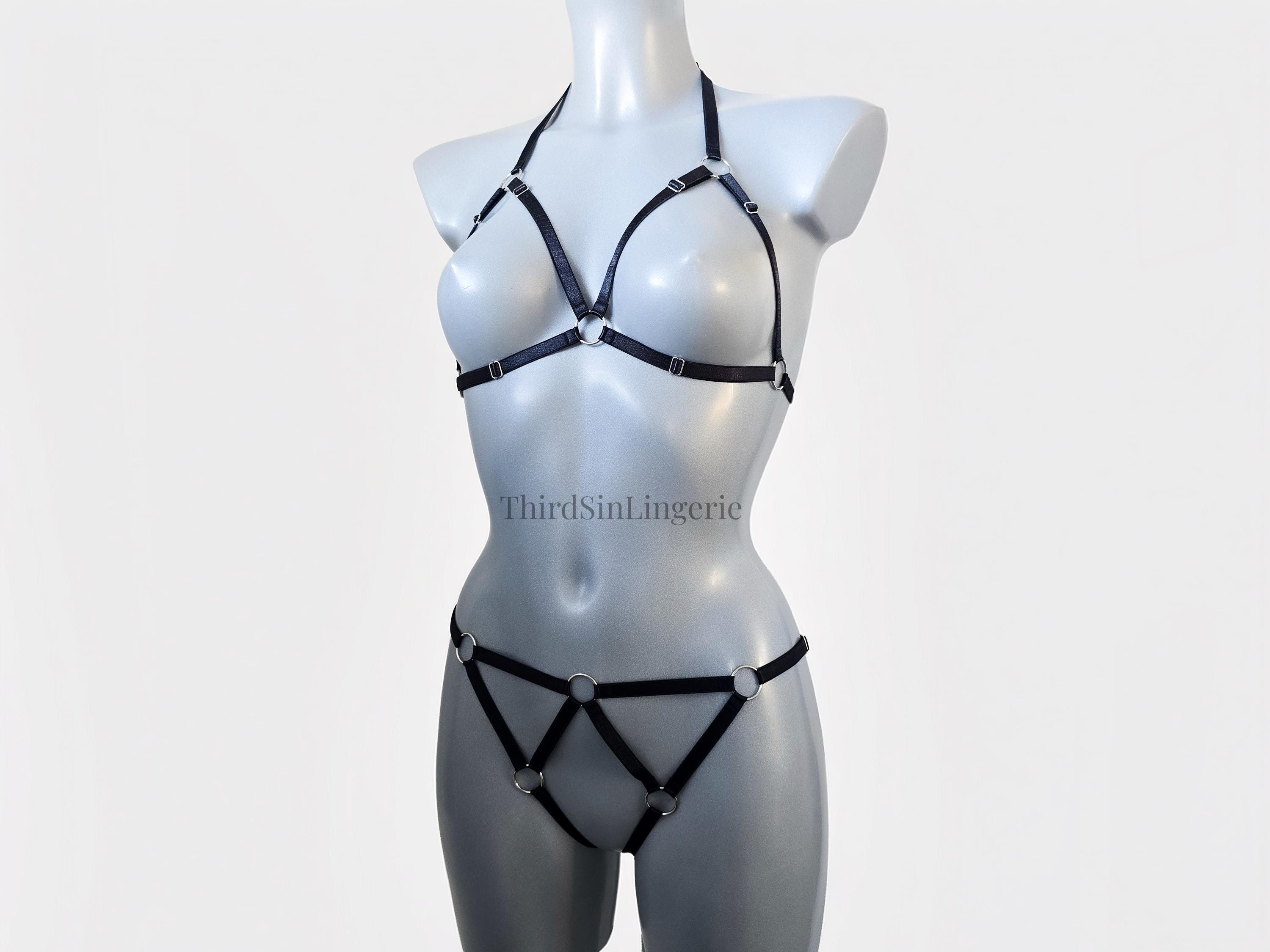 A bold harness bra and panty set designed to frame the body with clean, graphic lines. Wear it as lingerie or layer it over clothing for a striking statement look.