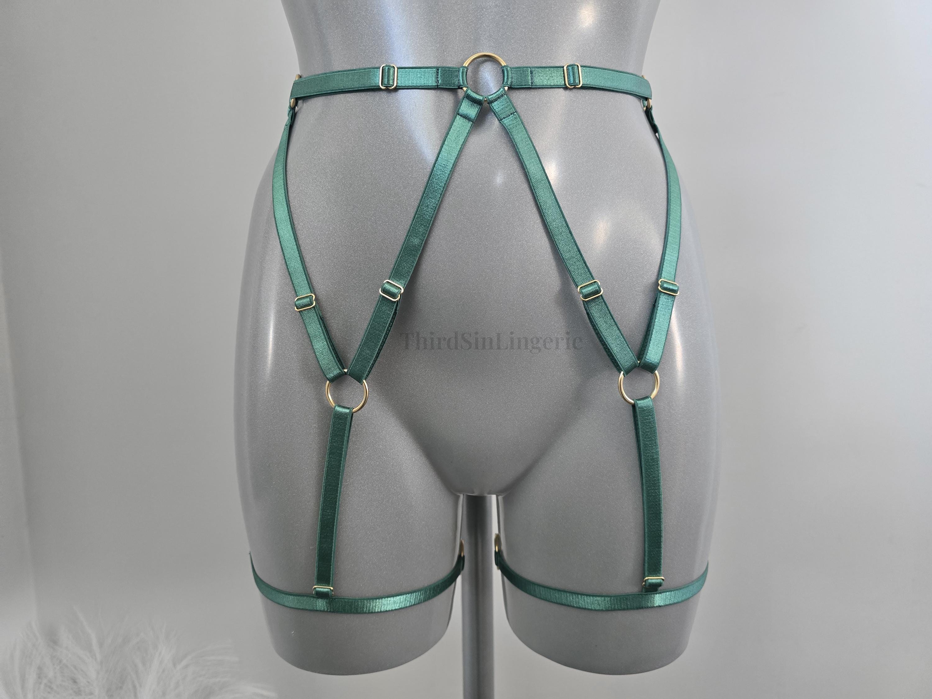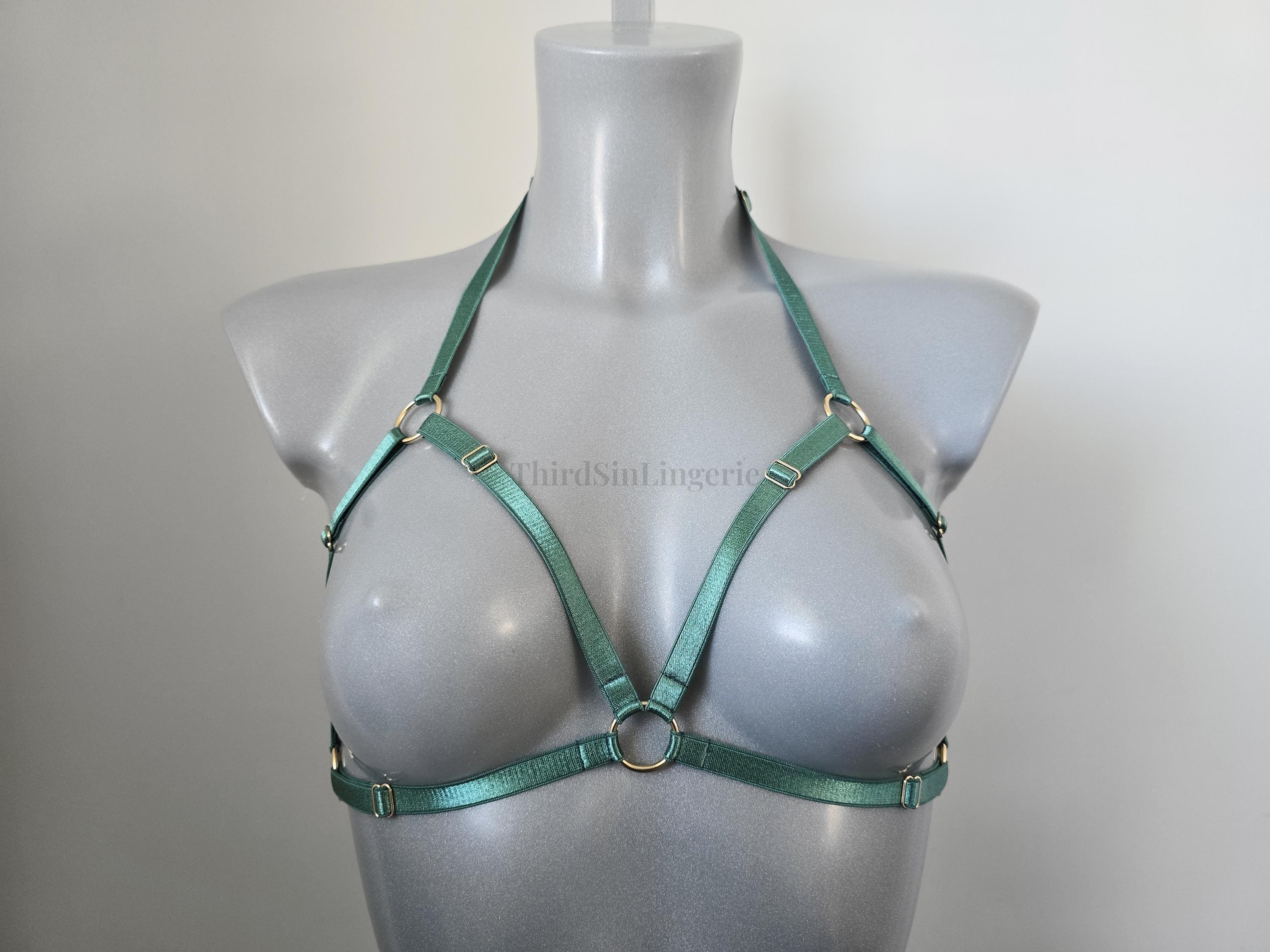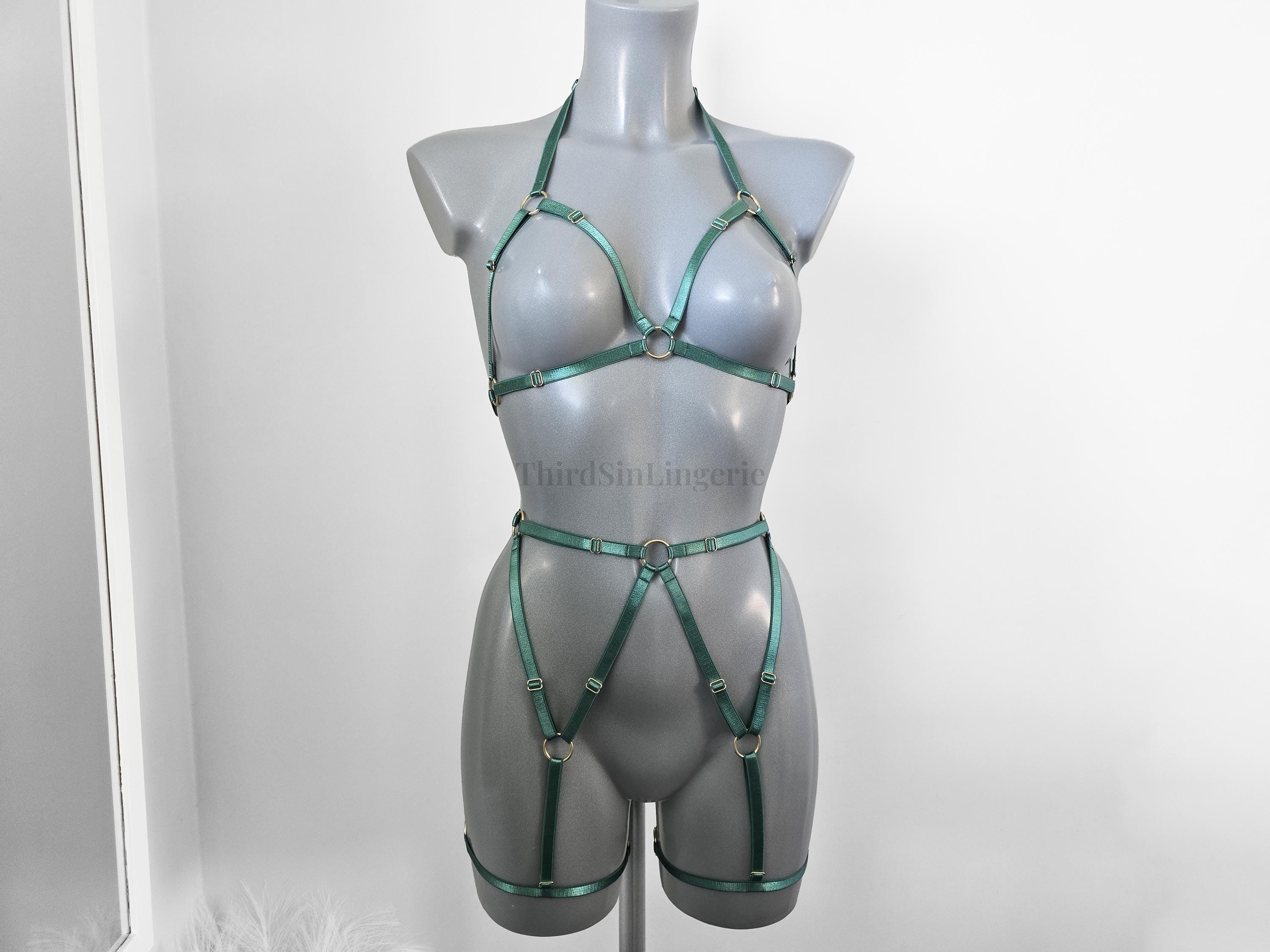 KARMA Emerald Green Harness Lingerie Set, Strappy Minimal Lingerie, Cupless Bra and Garters, Adjustable Festival Rave Outfit