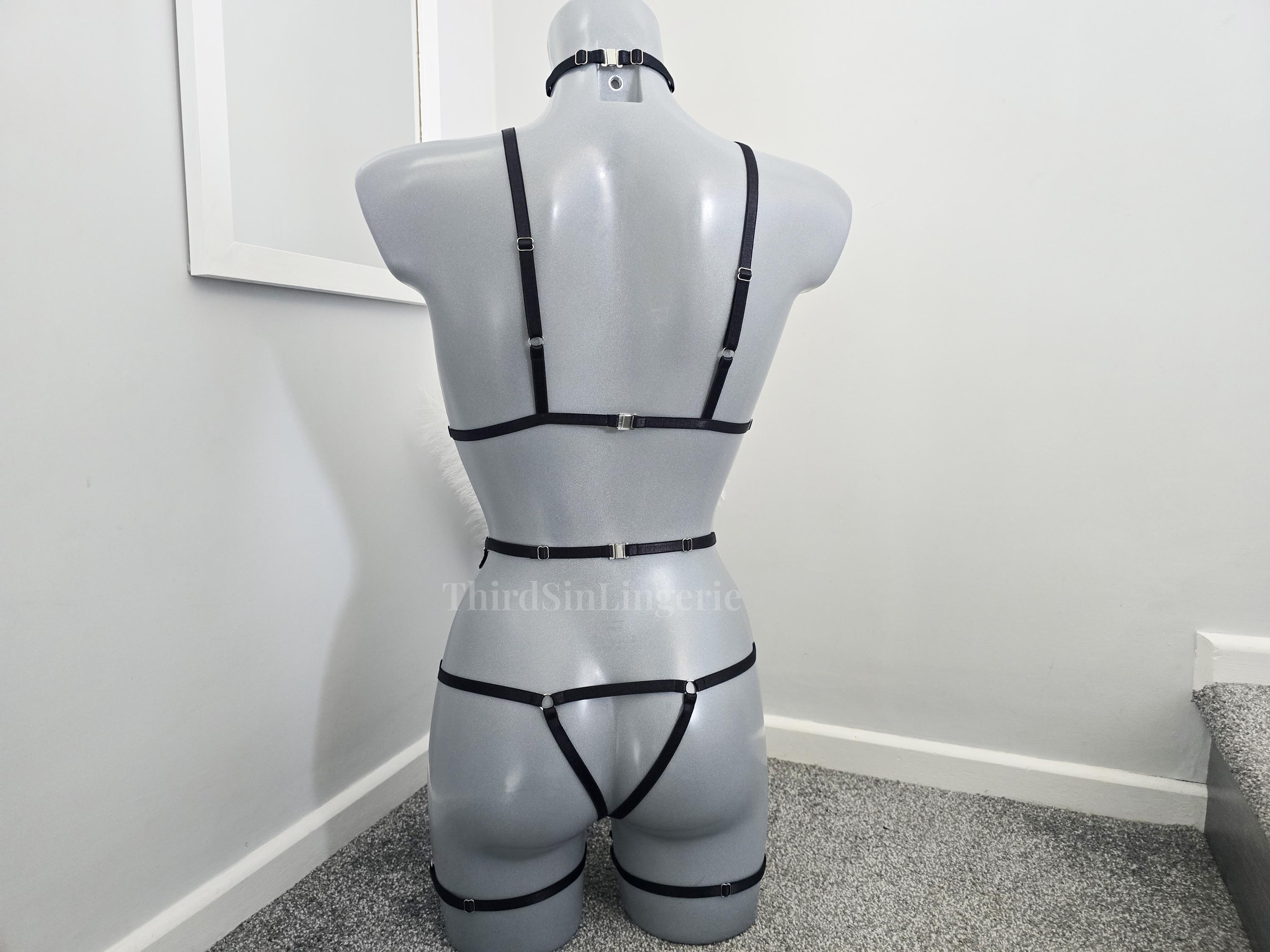 Full 4-piece harness set, featuring a coordinated bralette, matching bottom, garter belt, and choker. This complete set is perfect for creating a standout look, whether styled as lingerie or worn as part of a festival or layered outfit.