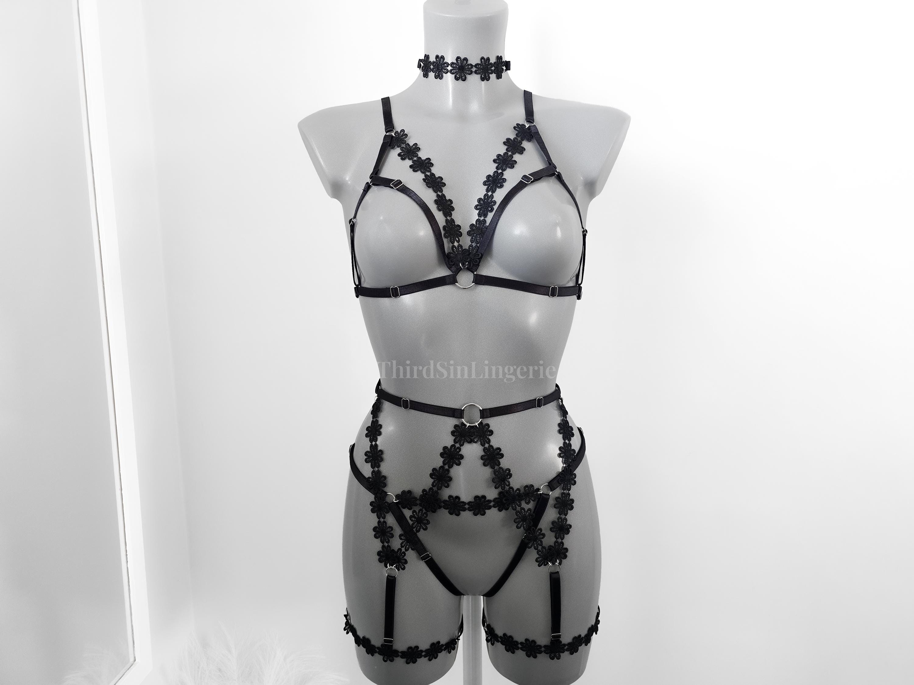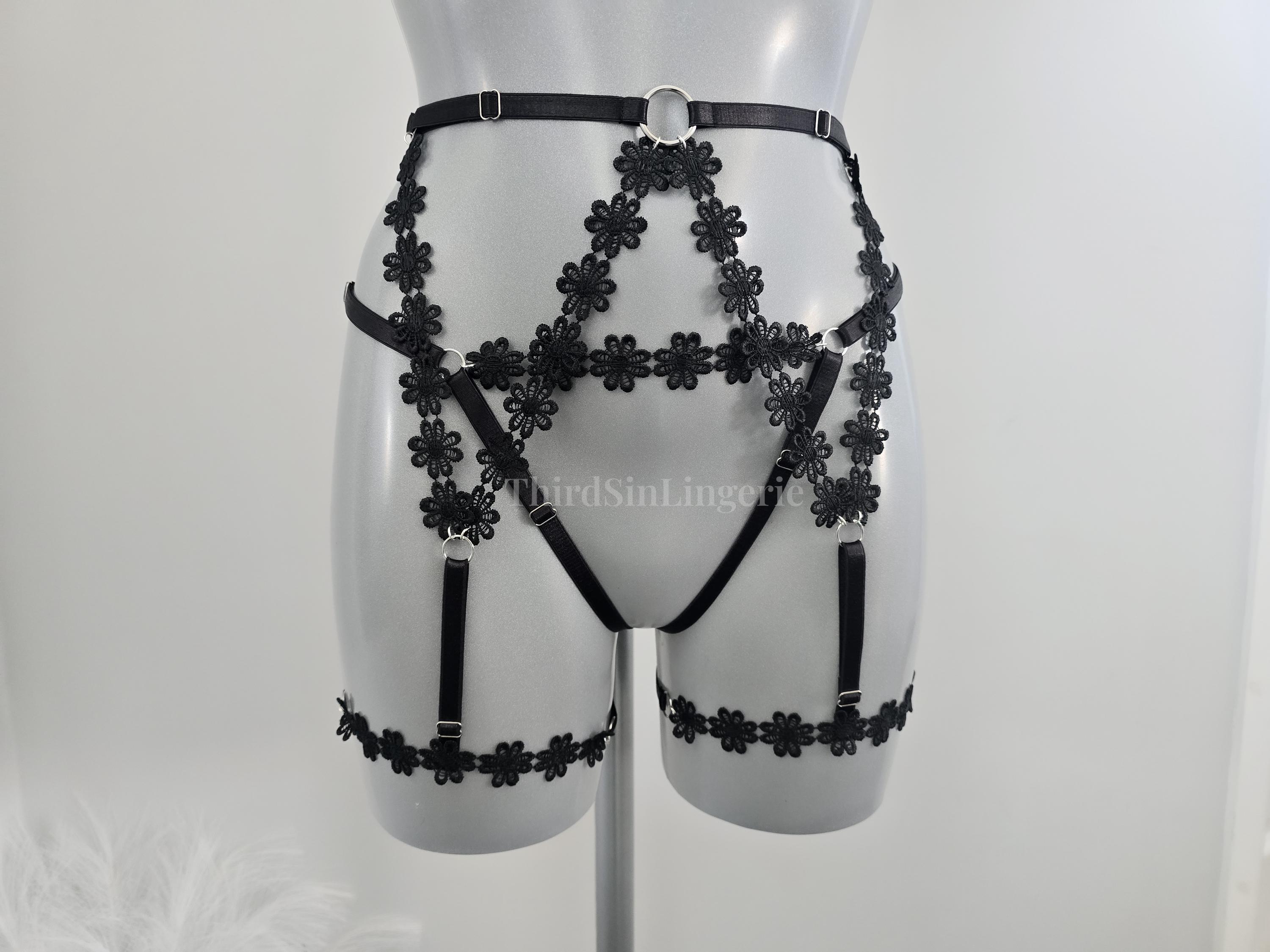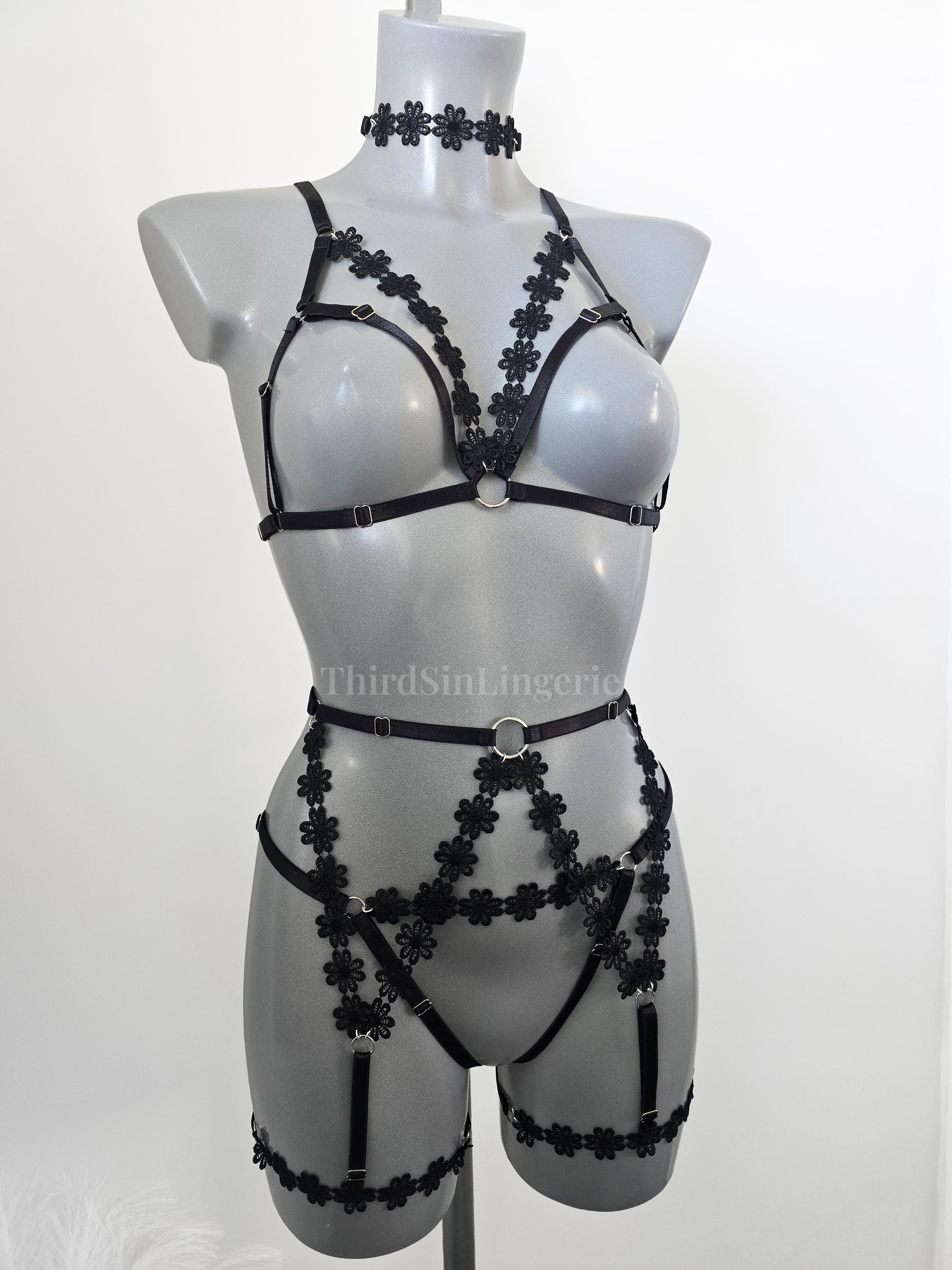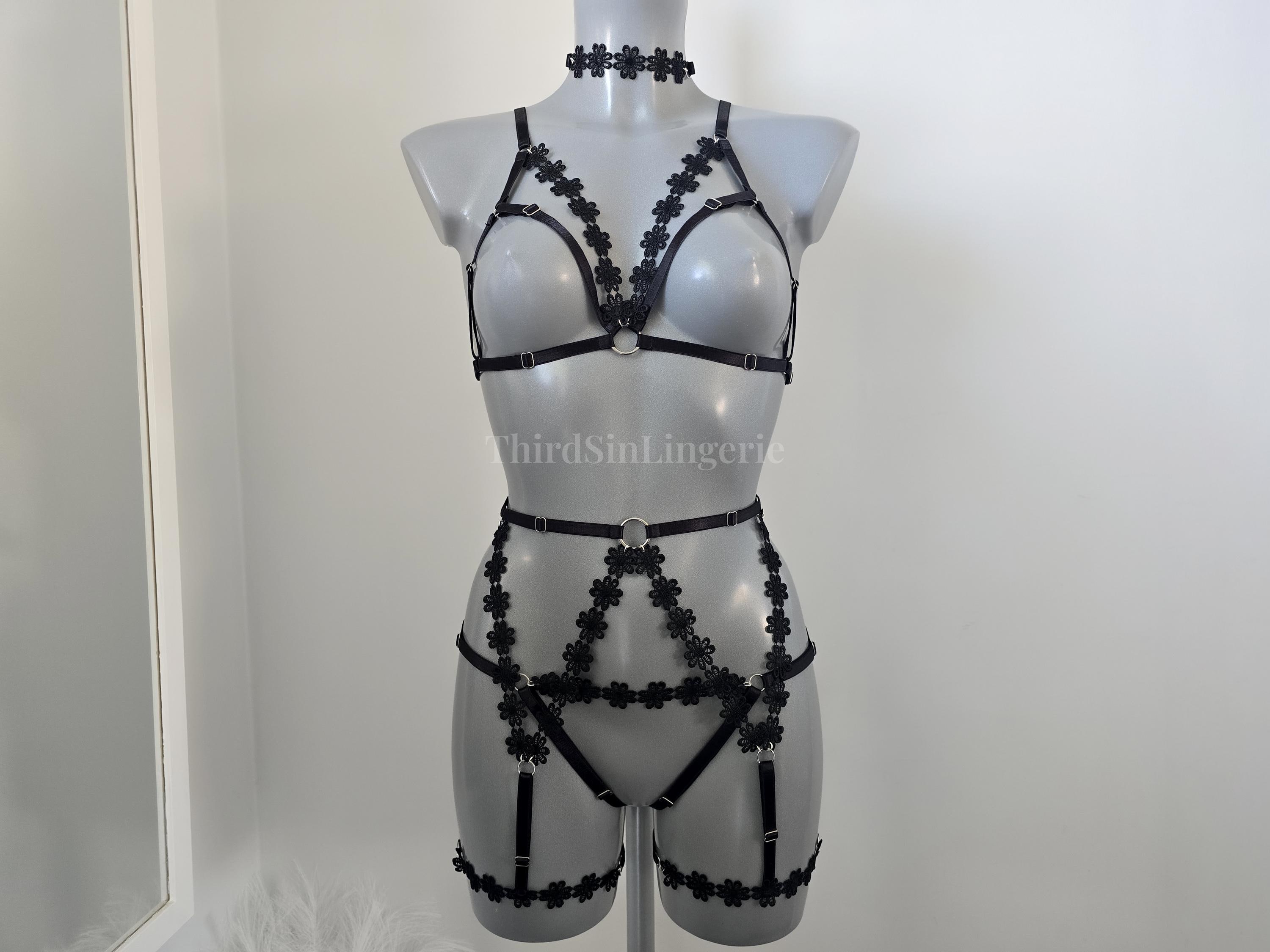 DAISY Floral Lace Harness Lingerie Set – Complete 4 Piece Set, Festival Rave Wear