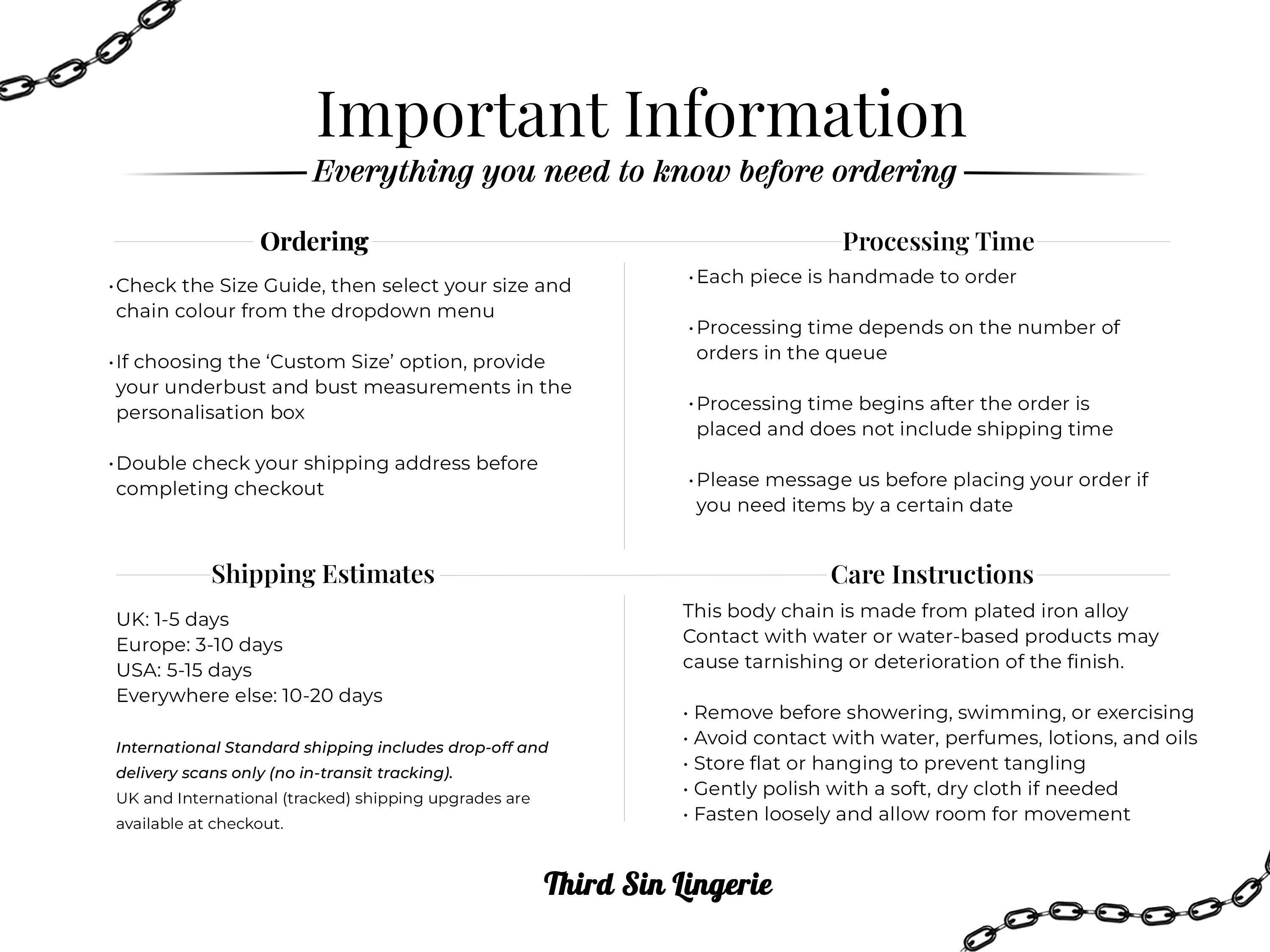 I, THIRDxSIN (Chelsea), am the data controller of your personal information as it relates to my shop. To fulfil your order, you must provide me with certain information (which you authorised Etsy to provide to me), such as your name, email address, postal address, payment information, and the details of the product that you’re ordering. You may also choose to provide me with additional personal information (for a custom order of jewellery, for example), if you contact me directly. I will only use these details to process and deliver your order, or deal with any queries you have related to that order. If you send me a message using the contact button on Etsy, I will receive your user name and email address. The only circumstances in which I will share your data are in processing your order, to settle disputes, to provide customer support or complying with the law. I will never use or pass on your information to third parties for marketing purposes or any other purpose, other than the circumstances listed below, or add you to any mailing list without your explicit consent. The circumstances in which I may share your data are :- With Etsy to comply with my obligations. With delivery companies to fulfil your order. To comply with legal or tax obligations. I will retain your details for as long as necessary in order to process the transaction and I will securely store any data collected during that period. I retain personal data related to orders or customer queries for 5 years. After this time I will delete your data from my records. You have the right to know what personal data I hold about you, and to ask for that data to be changed or deleted. You also have the right to complain to the ICO if you believe there is a problem with the way I handle your data. If you have any concerns about your personal data, please contact support@Etsy. In addition to my own privacy policy, if you pay with PayPal, your data will be protected by PayPal's privacy policy. If you pay directly by card on Etsy, your personal data is protected by Etsy's privacy policy.
