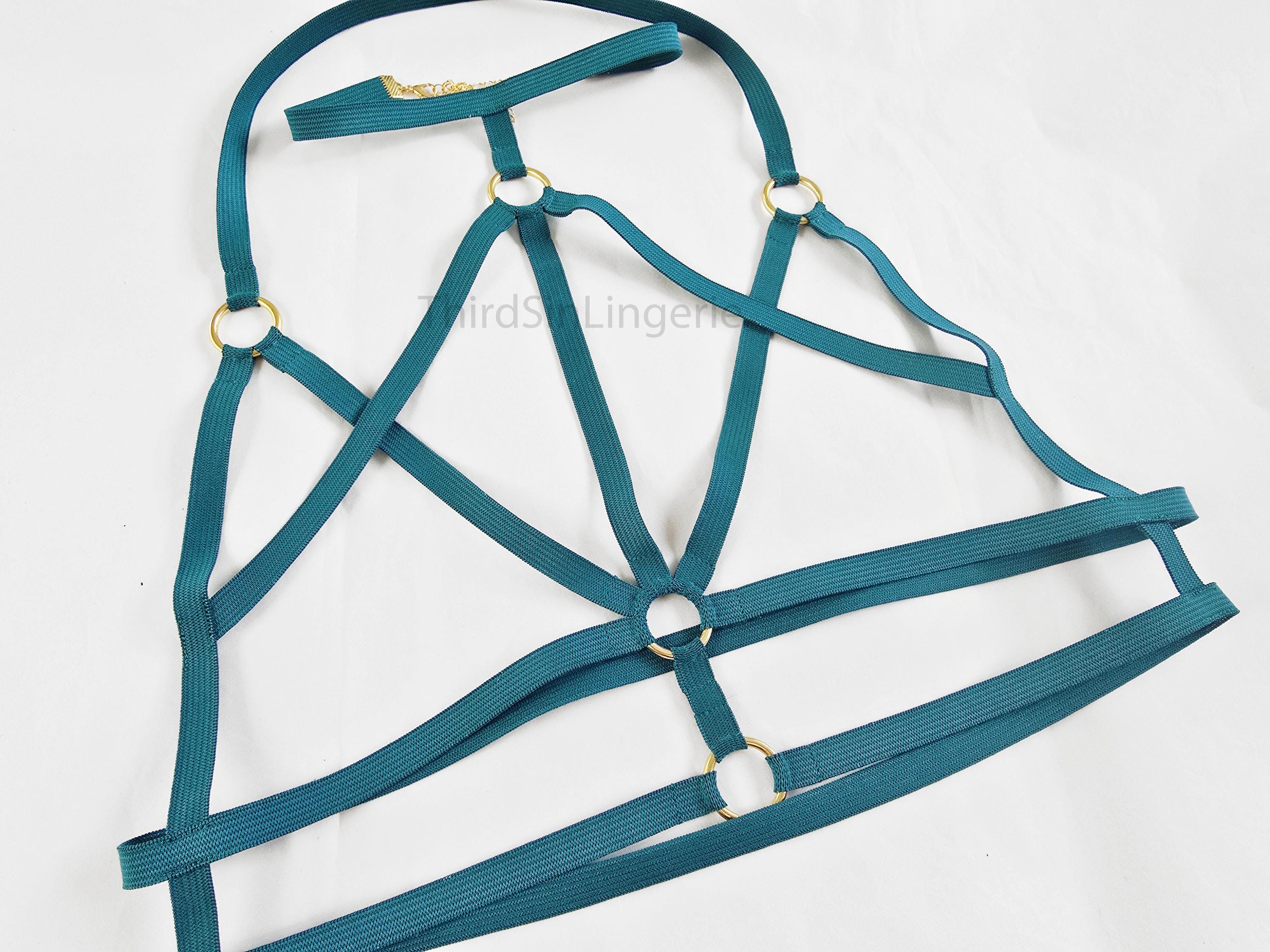 A strappy, body-hugging harness bra designed to frame the body with clean, structured lines. Featuring an open, cupless design, this piece is handmade to order using high-quality elastic and custom fitted to your measurements for comfort, confidence, and a secure fit. Style it as lingerie or layer it over clothing for a striking, fashion-forward look.