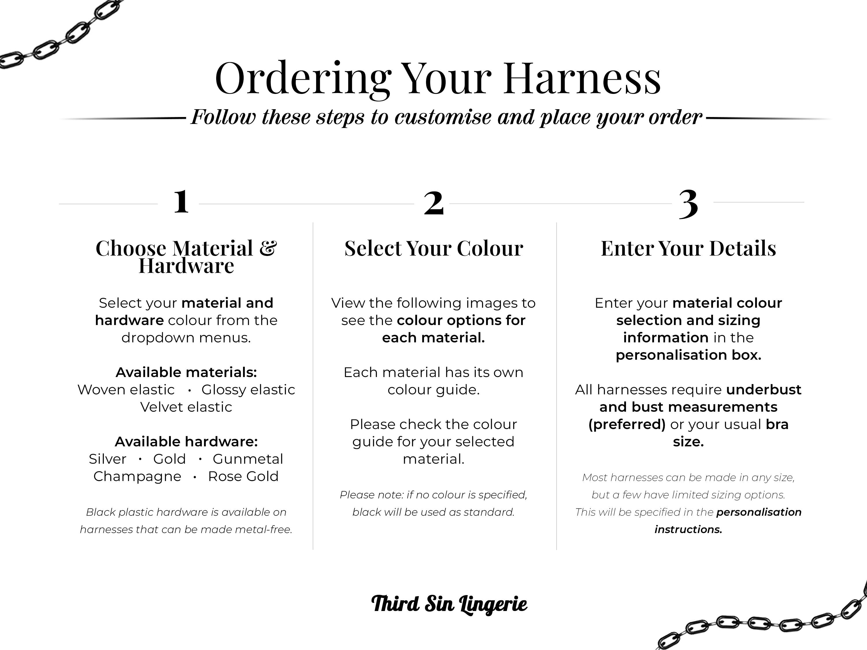 My harnesses are sized using UK bra measurements. If you need help converting your size to UK, or you’re unsure which size to choose, please message me before ordering.
